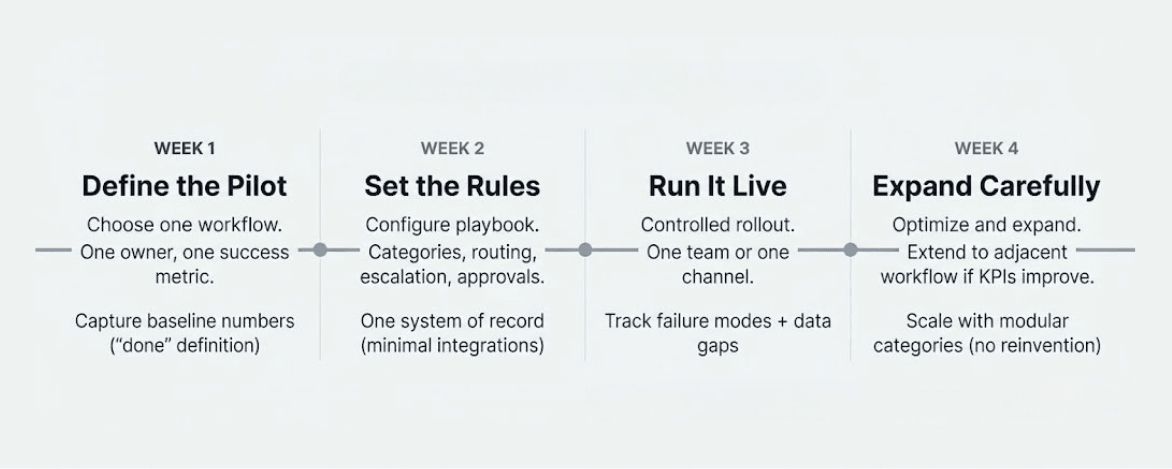 Roll out to one team or one channel. Track failure modes: where escalation happens, why it happens, and what data gaps block completion.