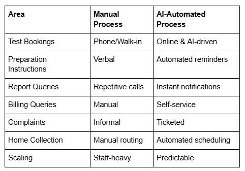 AI automation enables diagnostic labs to modernise patient-facing and internal workflows, improving accuracy, speed, and trust without increasing staff count.