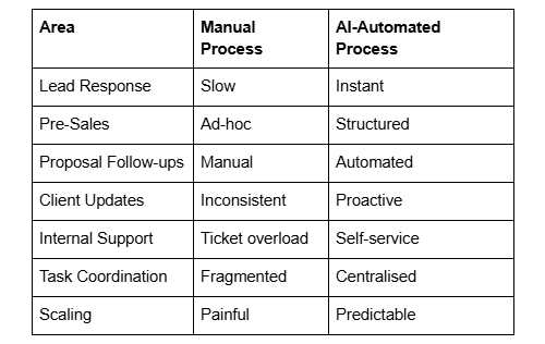 AI automation brings structure to sales, delivery, and internal operations, freeing teams to focus on value creation.