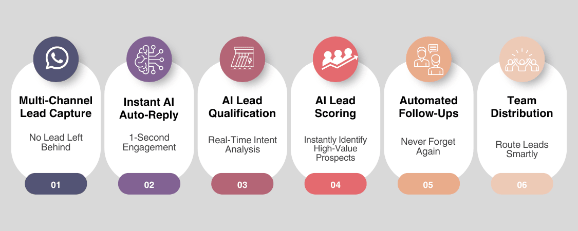 The moment a lead arrives, the AI kicks in with a personalized welcome message and relevant questions. It behaves like a 24×7 sales assistant that never delays, never forgets, and never gets busy. This single change can reduce lead loss by half.