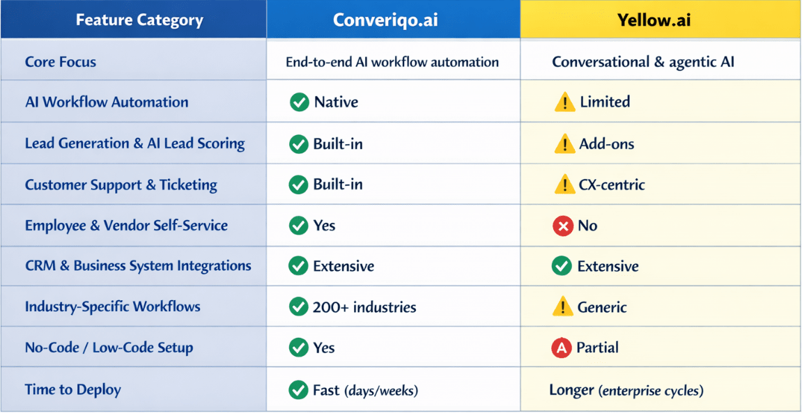 While both offer AI-powered automation, they are built with very different philosophies. Yellow.ai is widely known as an enterprise conversational AI platform, whereas Converiqo positions itself as a full-stack AI workflow automation platform designed to automate entire business processes, not just conversations.