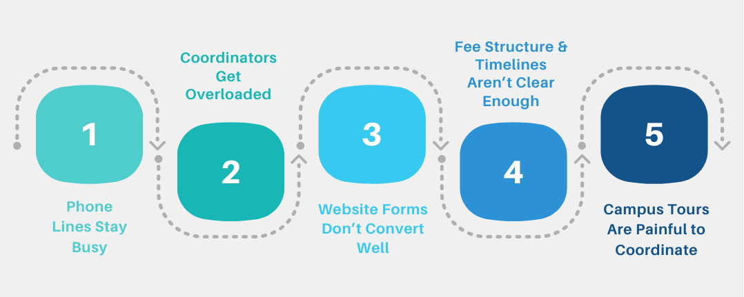 Yet many schools still struggle with the basics. Constant phone calls, confused parents, overloaded coordinators, unclear communication about fees, and chaotic tour scheduling create friction at every step.